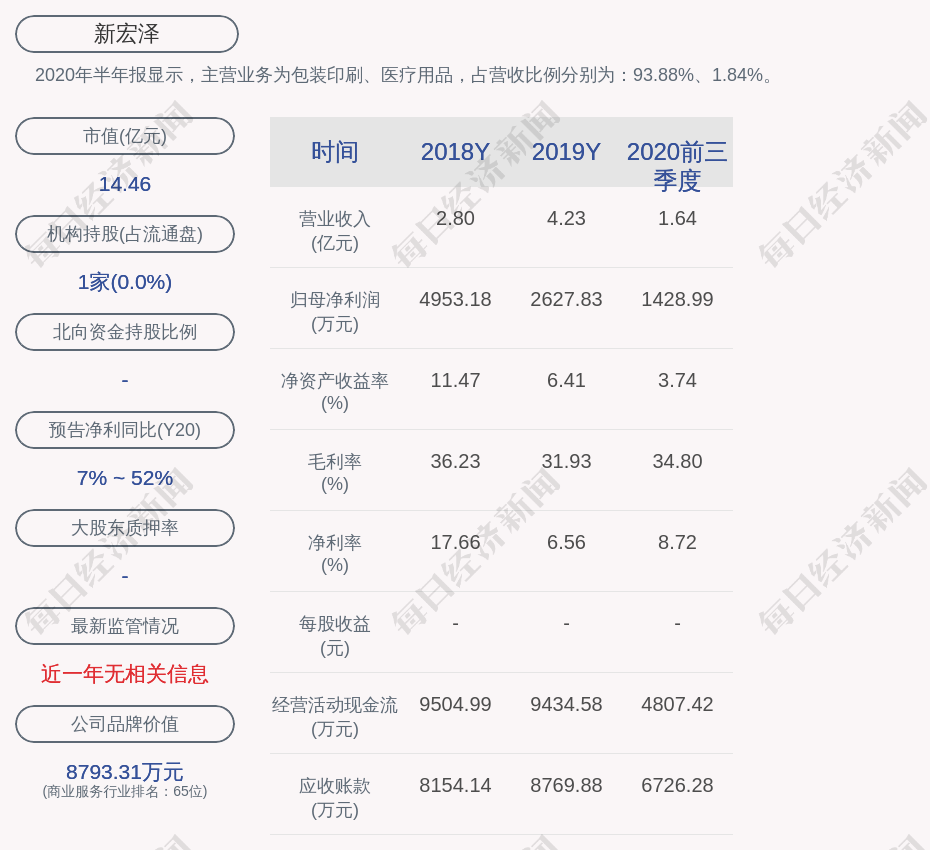 2020年半年报显示,新宏泽的主营业务为包装印刷、医疗用品,占营收比例分别为:93.88%、1.84%。