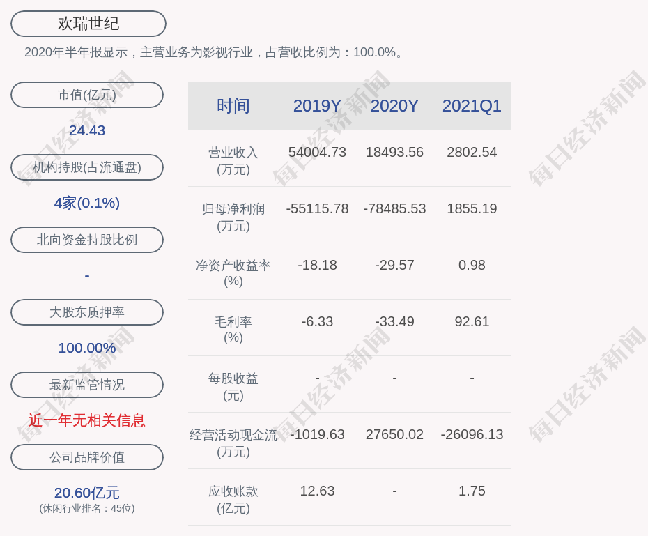 2020年半年报显示,欢瑞世纪的主营业务为影视行业,占营收比例为:100.0%。