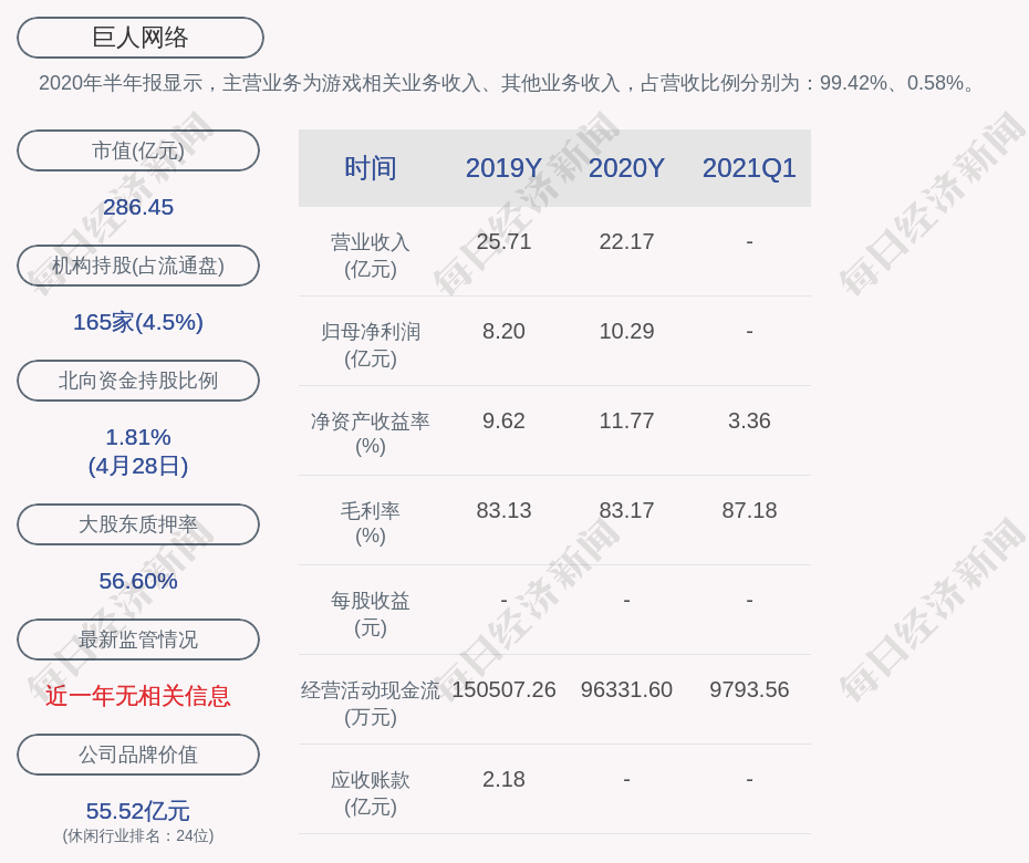2020年半年报显示,巨人网络的主营业务为游戏相关业务收入、其他业务收入,占营收比例分别为:99.42%、0.58%。