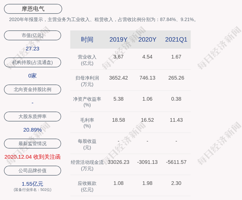 2020年年报显示,摩恩电气的主营业务为工业收入、租赁收入,占营收比例分别为:87.84%、9.21%。