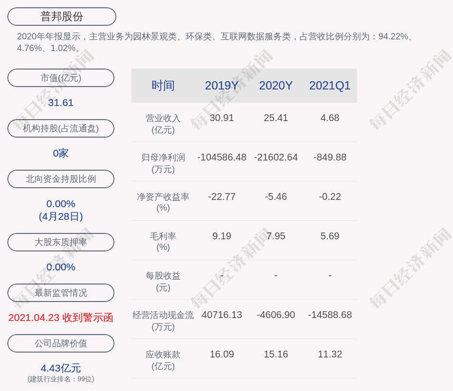 2020年年报显示,普邦股份的主营业务为园林景观类、环保类、互联网数据服务类,占营收比例分别为:94.22%、4.76%、1.02%。