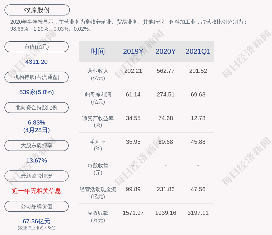2020年半年报显示,牧原股份的主营业务为畜牧养殖业、贸易业务、其他行业、饲料加工业,占营收比例分别为:98.66%、1.29%、0.03%、0.02%。