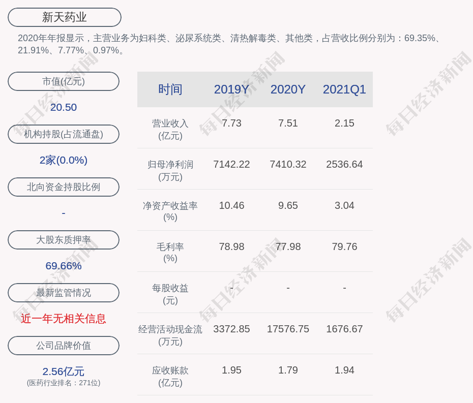 2020年年报显示,新天药业的主营业务为妇科类、泌尿系统类、清热解毒类、其他类,占营收比例分别为:69.35%、21.91%、7.77%、0.97%。