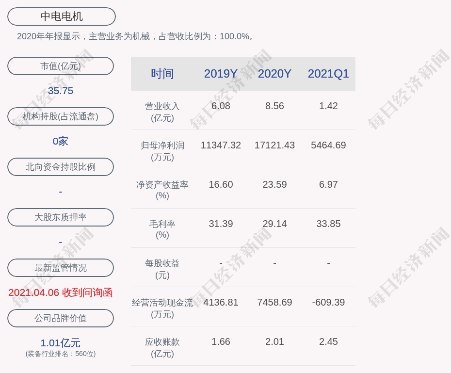 2020年年报显示,中电电机的主营业务为机械,占营收比例为:100.0%。