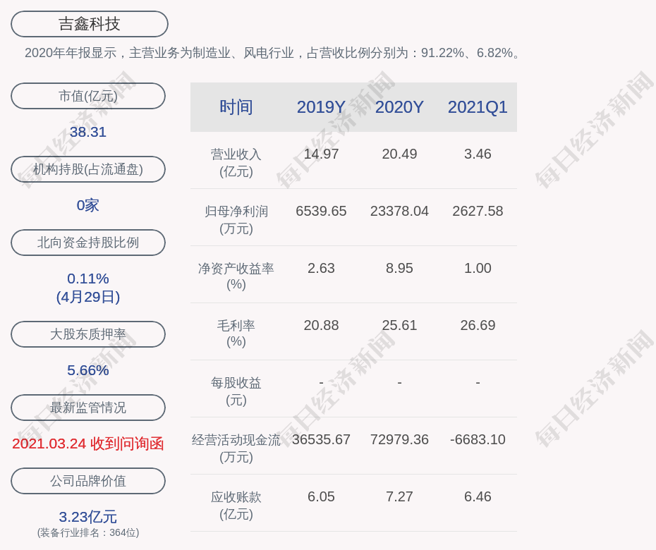 2020年年报显示,吉鑫科技的主营业务为制造业、风电行业,占营收比例分别为:91.22%、6.82%。