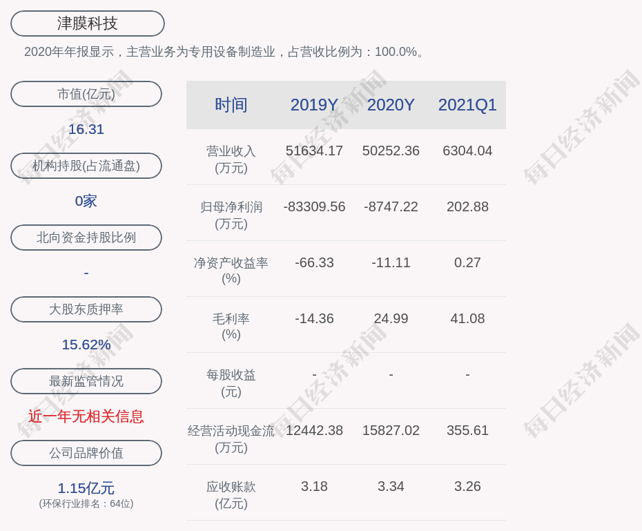 2020年年报显示,津膜科技的主营业务为专用设备制造业,占营收比例为:100.0%。