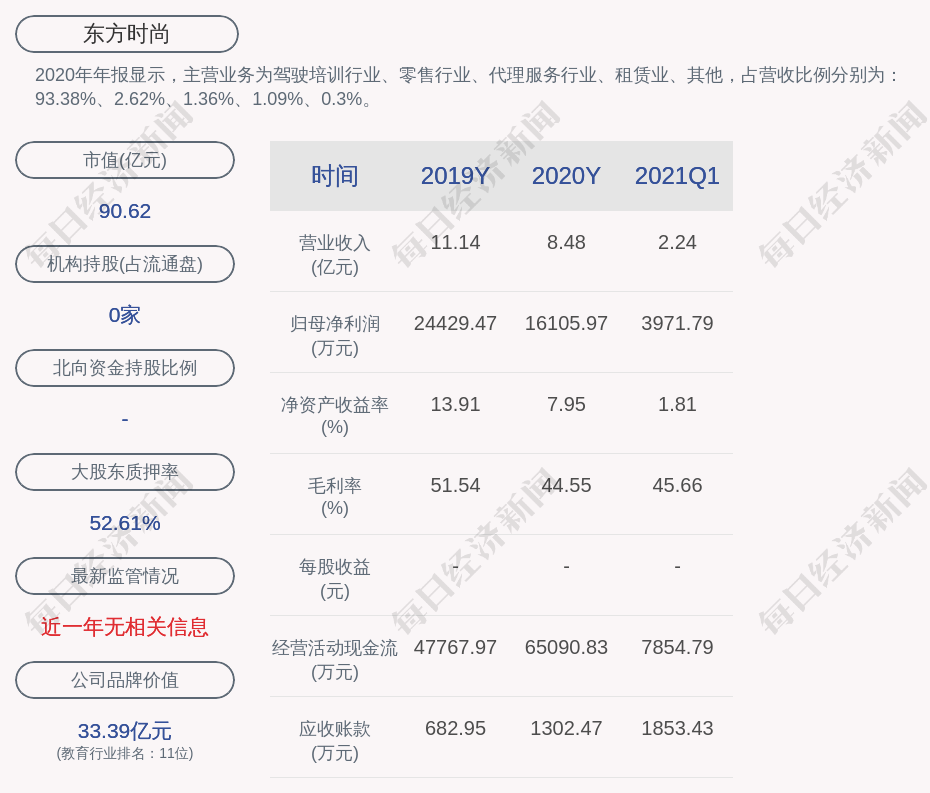 2020年年报显示,东方时尚的主营业务为驾驶培训行业、零售行业、代理服务行业、租赁业、其他,占营收比例分别为:93.38%、2.62%、1.36%、1.09%、0.3%。
