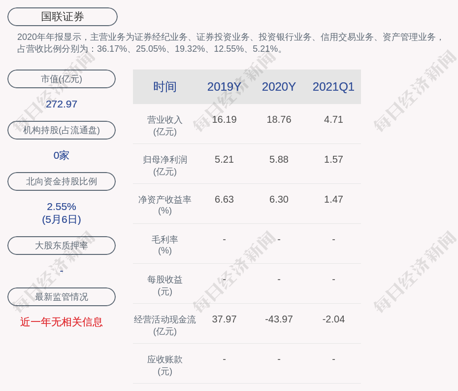 2020年年报显示,国联证券的主营业务为证券经纪业务、证券投资业务、投资银行业务、信用交易业务、资产管理业务,占营收比例分别为:36.17%、25.05%、19.32%、12.55%、5.21%。