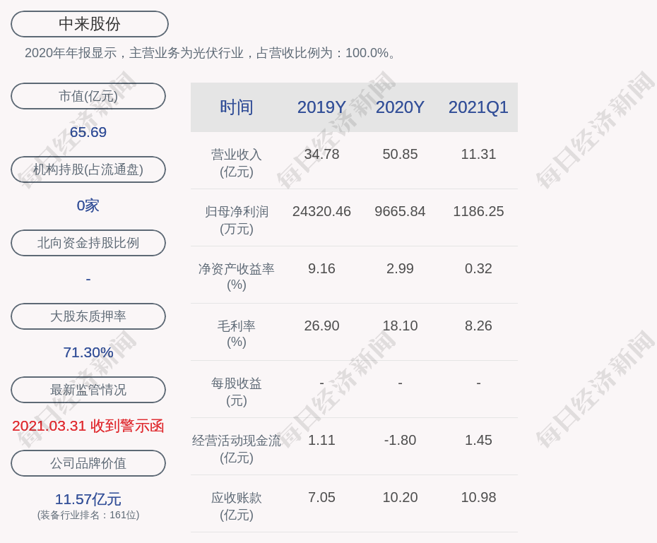 2020年年报显示,中来股份的主营业务为光伏行业,占营收比例为:100.0%。