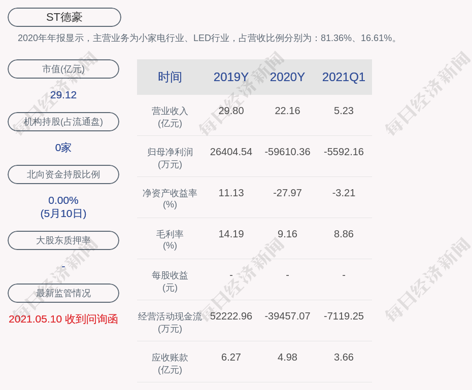 2020年年报显示,ST德豪的主营业务为小家电行业、LED行业,占营收比例分别为:81.36%、16.61%。