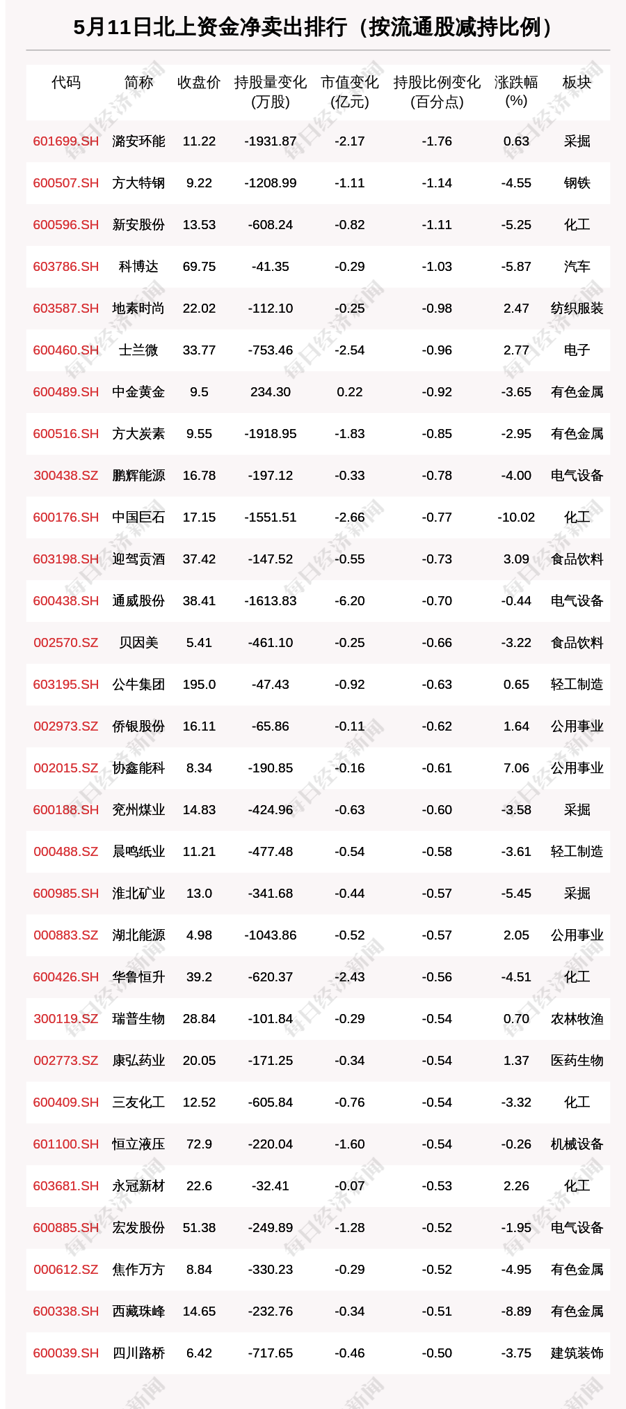 每经AI快讯,5月11日,北上资金净卖出的个股共有702只,北上资金减仓比例超1%的有619只。其中,潞安环能(601699.SH,收盘价:11.22元)减仓比例最为明显,最新持股比例9.37%,环比减少1.76个百分点。其他北上资金减仓比例较多的个股还包括方大特钢(600507.SH,收盘价:9.22元)、新安股份(600596.SH,收盘价:13.53元)、科博达(603786.SH,收盘价:69.75元)。