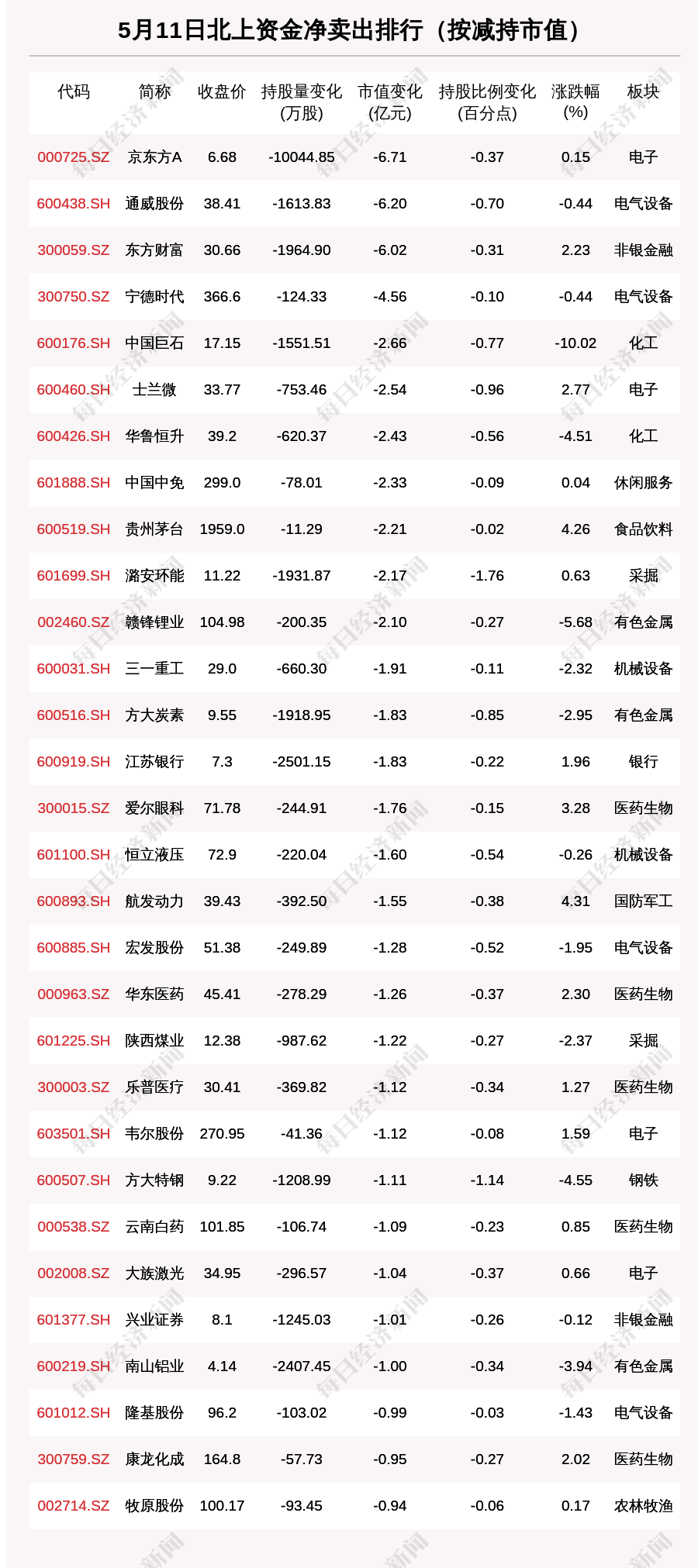 5月11日,按照北向资金减持市值排序,京东方A(000725.SZ,收盘价:6.68元)减持市值最大,减持市值6.710亿元,环比减少3.91%。其他北上资金减持市值较多的个股还包括通威股份(600438.SH,收盘价:38.41元)、东方财富(300059.SZ,收盘价:30.66元)、宁德时代(300750.SZ,收盘价:366.6元)。