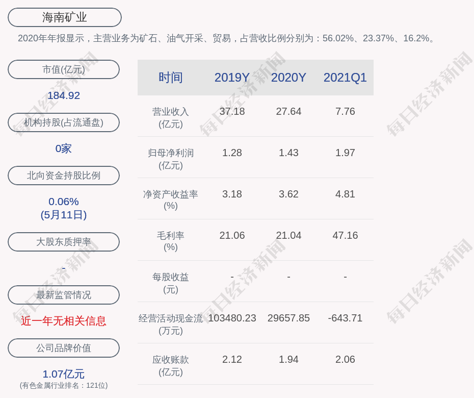 2020年年报显示,海南矿业的主营业务为矿石、油气开采、贸易,占营收比例分别为:56.02%、23.37%、16.2%。