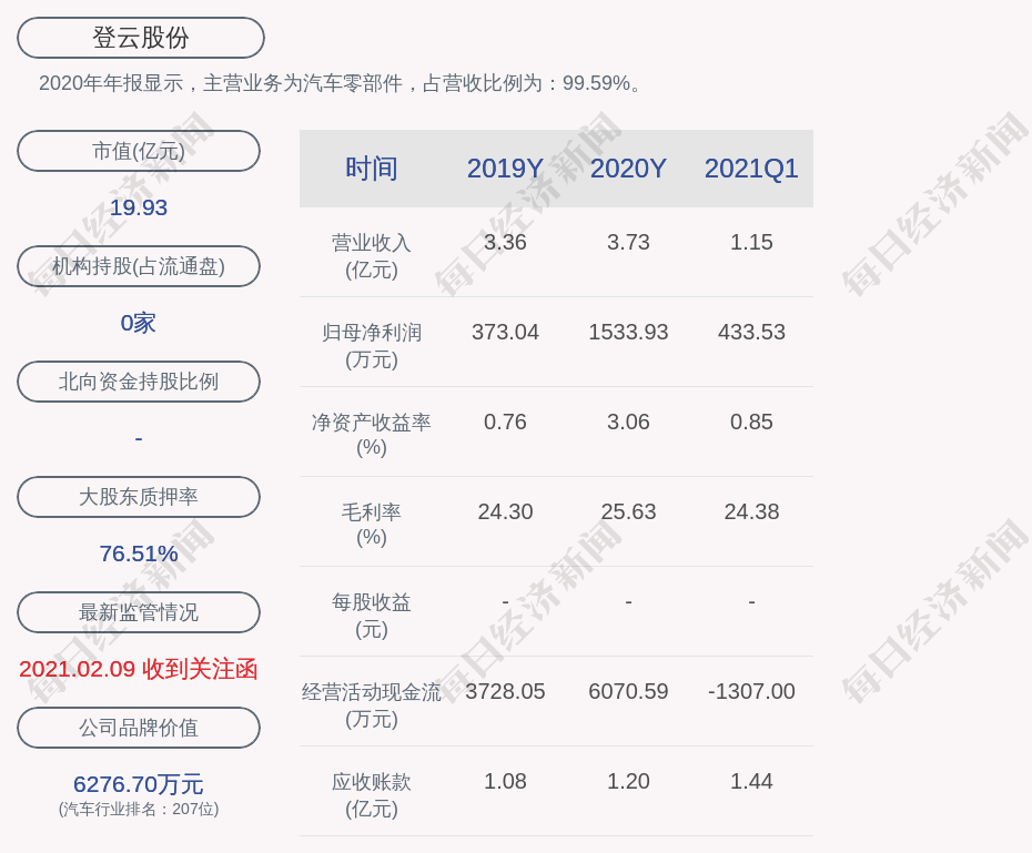 2020年年报显示,登云股份的主营业务为汽车零部件,占营收比例为:99.59%。