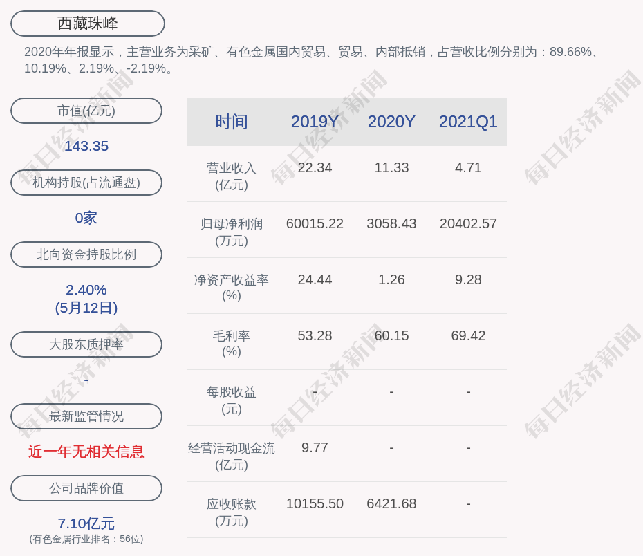 2020年年报显示,西藏珠峰的主营业务为采矿、有色金属国内贸易、贸易、内部抵销,占营收比例分别为:89.66%、10.19%、2.19%、-2.19%。