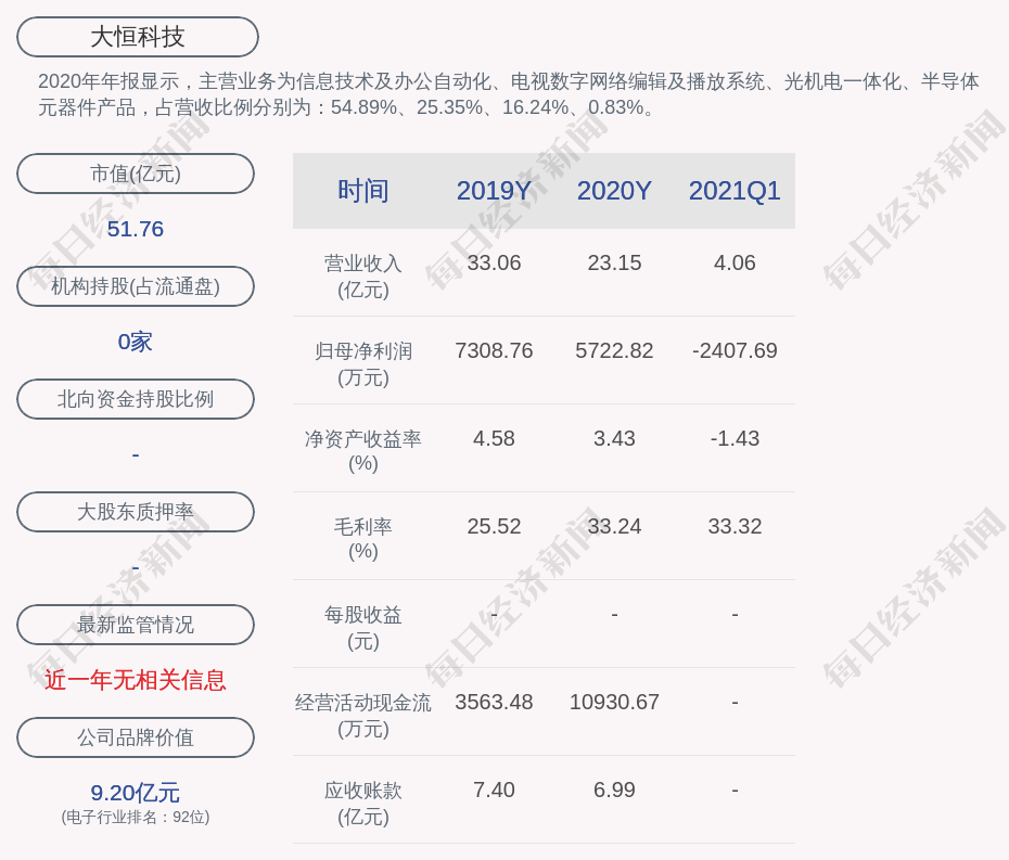 2020年年报显示,大恒科技的主营业务为信息技术及办公自动化、电视数字网络编辑及播放系统、光机电一体化、半导体元器件产品,占营收比例分别为:54.89%、25.35%、16.24%、0.83%。