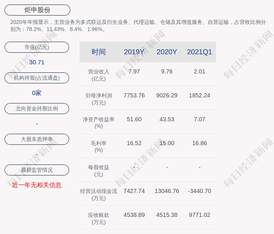 2020年年报显示,炬申股份的主营业务为多式联运及衍生业务、代理运输、仓储及其增值服务、自营运输,占营收比例分别为:78.2%、11.43%、8.4%、1.96%。