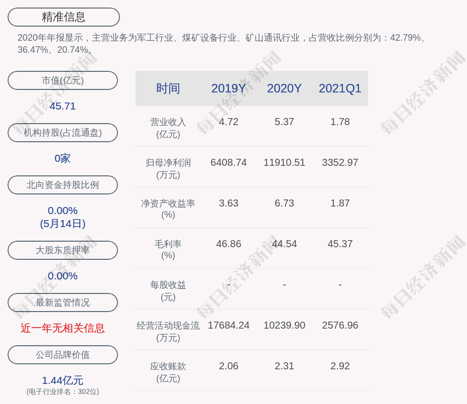 2020年年报显示,精准信息的主营业务为军工行业、煤矿设备行业、矿山通讯行业,占营收比例分别为:42.79%、36.47%、20.74%。