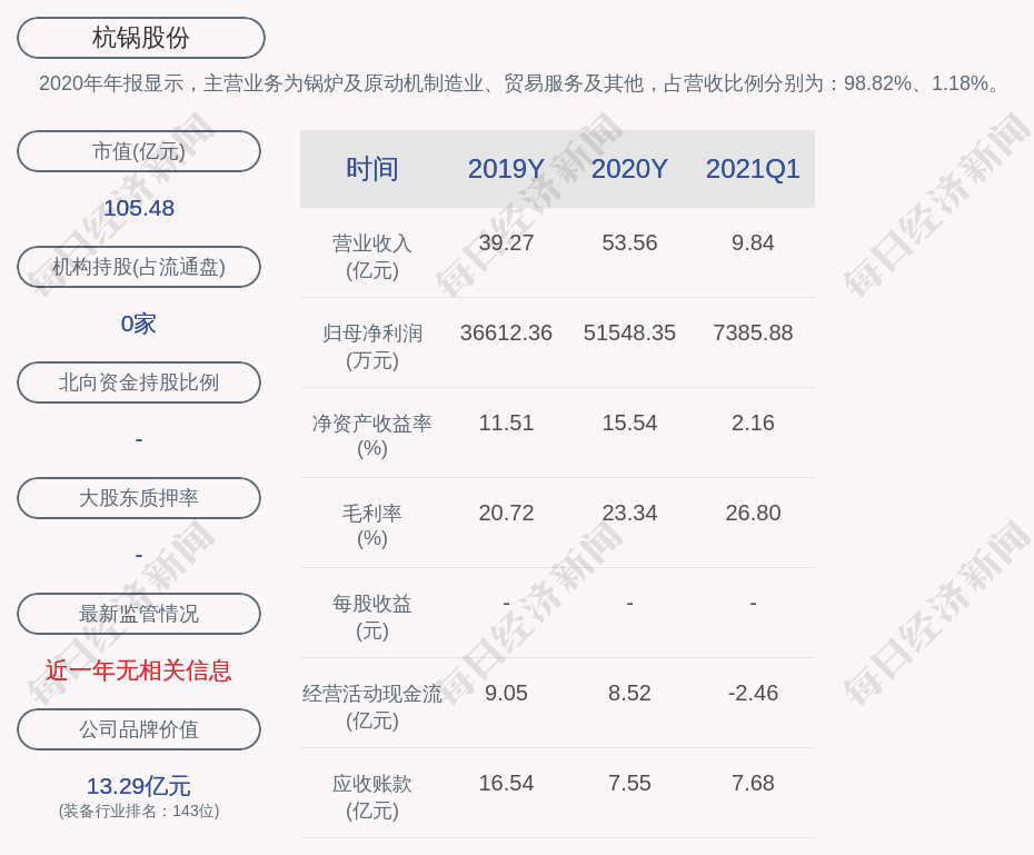 2020年年报显示,杭锅股份的主营业务为锅炉及原动机制造业、贸易服务及其他,占营收比例分别为:98.82%、1.18%。