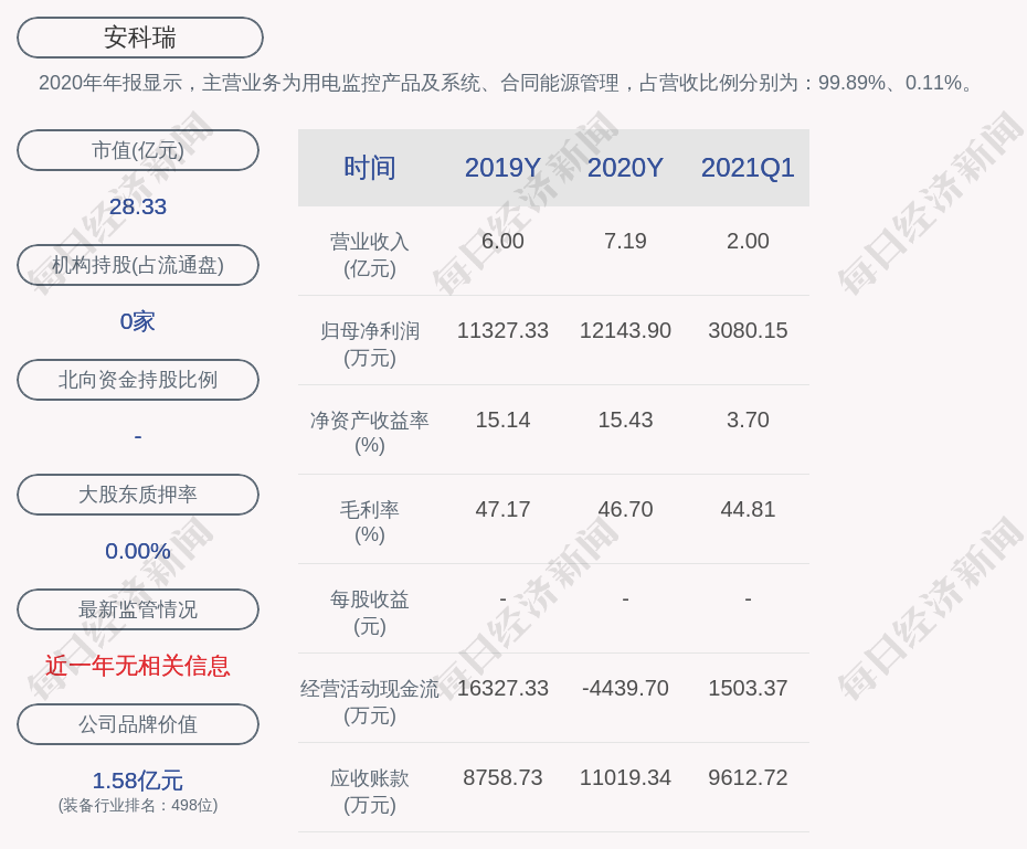 2020年年报显示,安科瑞的主营业务为用电监控产品及系统、合同能源管理,占营收比例分别为:99.89%、0.11%。