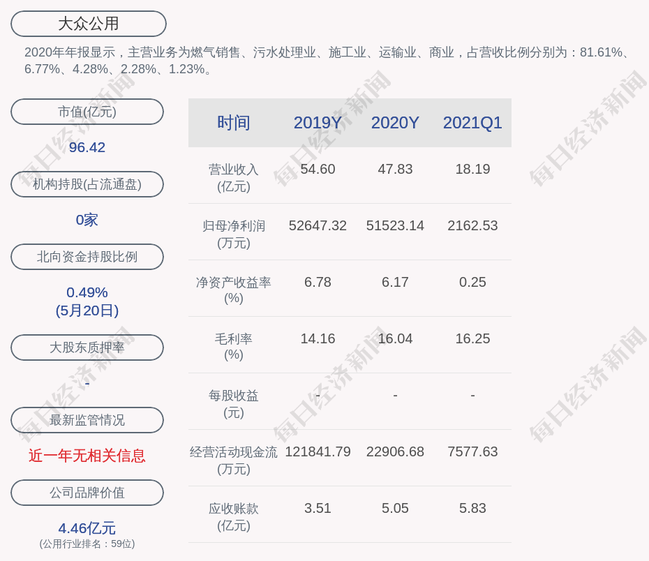 2020年年报显示,大众公用的主营业务为燃气销售、污水处理业、施工业、运输业、商业,占营收比例分别为:81.61%、6.77%、4.28%、2.28%、1.23%。