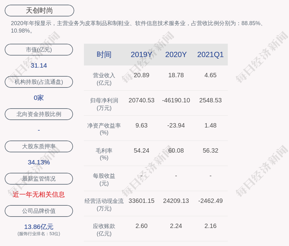 2020年年报显示,天创时尚的主营业务为皮革制品和制鞋业、软件信息技术服务业,占营收比例分别为:88.85%、10.98%。