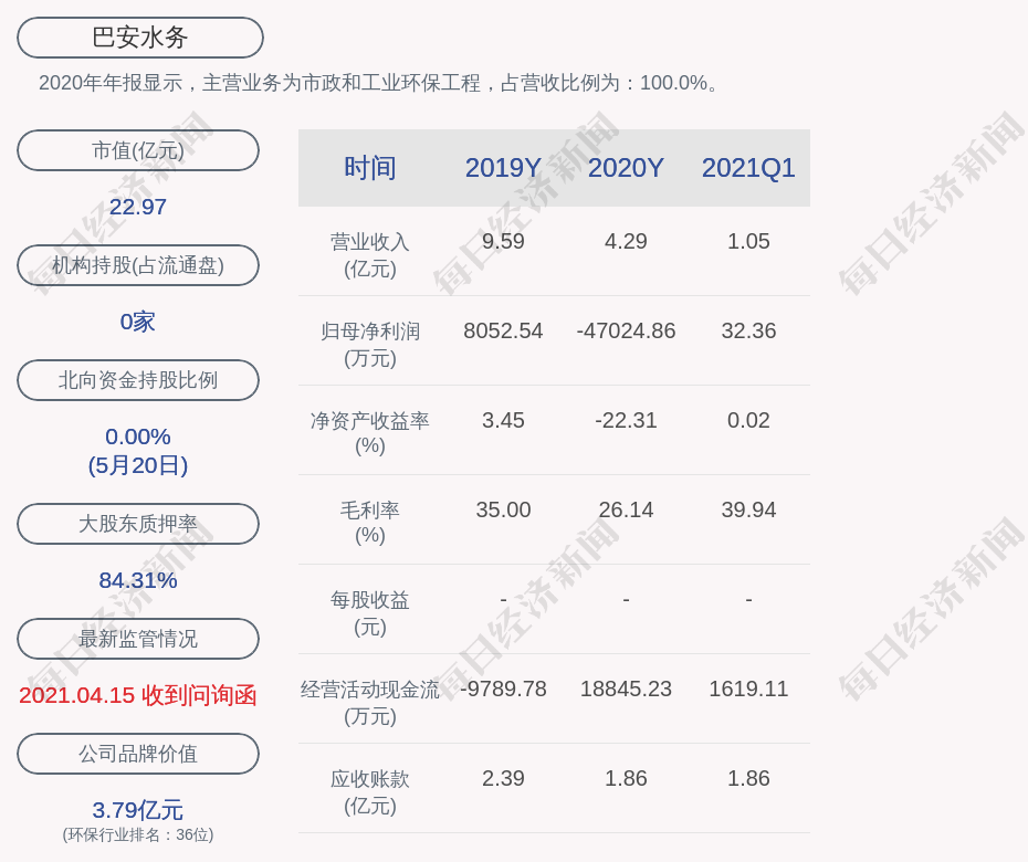 2020年年报显示,巴安水务的主营业务为市政和工业环保工程,占营收比例为:100.0%。