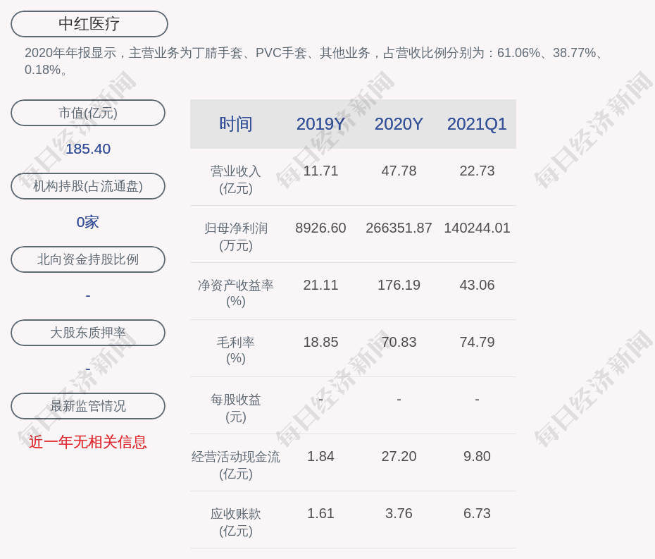 2020年年报显示,中红医疗的主营业务为丁腈手套、PVC手套、其他业务,占营收比例分别为:61.06%、38.77%、0.18%。