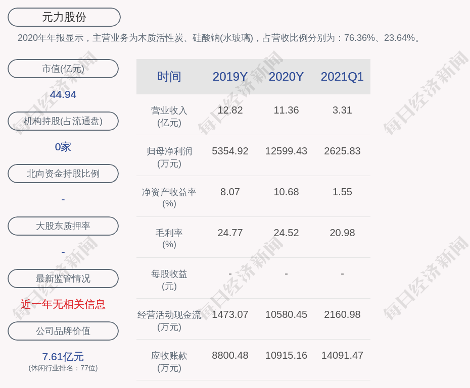 2020年年报显示,元力股份的主营业务为木质活性炭、硅酸钠(水玻璃),占营收比例分别为:76.36%、23.64%。