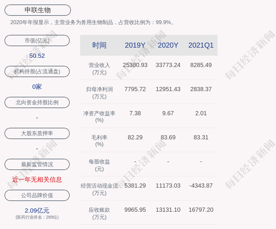 2020年年报显示,申联生物的主营业务为兽用生物制品,占营收比例为:99.9%。