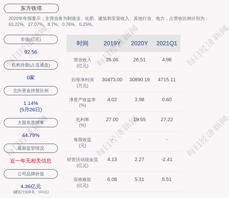 2020年年报显示,东方铁塔的主营业务为制造业、化肥、建筑和安装收入、其他行业、电力,占营收比例分别为:63.22%、27.07%、8.7%、0.76%、0.25%。