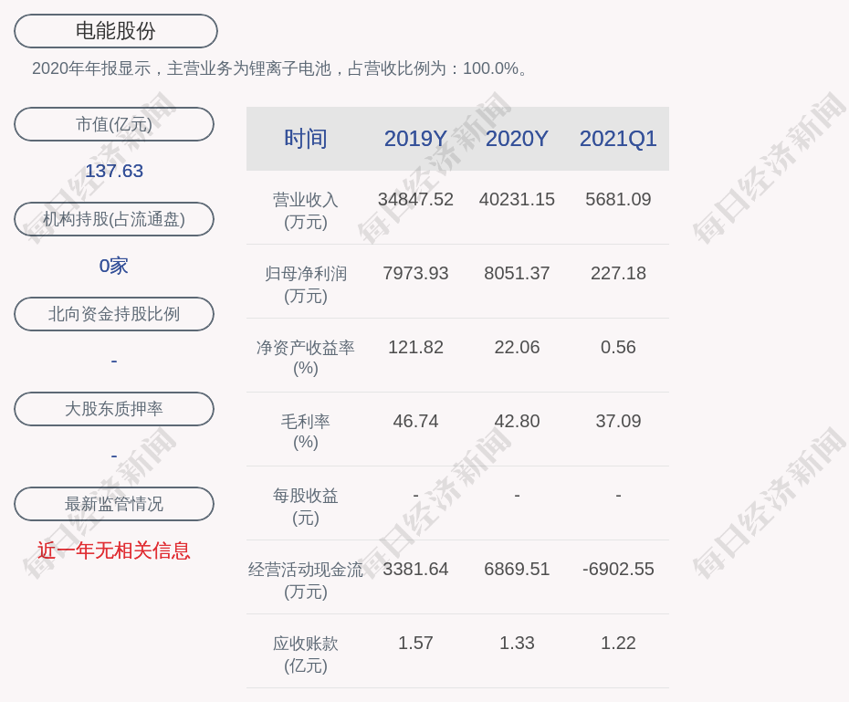 2020年年报显示,电能股份的主营业务为锂离子电池,占营收比例为:100.0%。