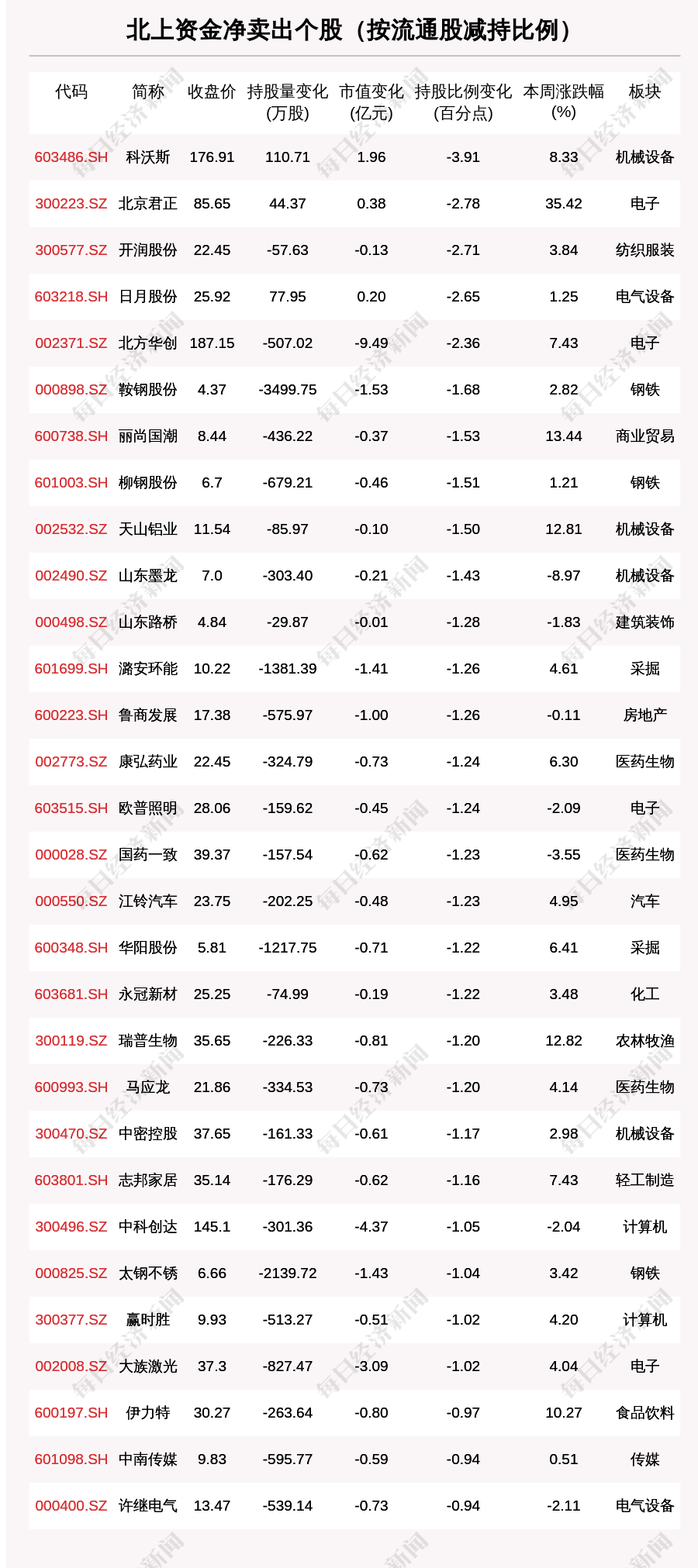一周北上资金净卖出个股共有542只,北上资金减仓比例超1%的有500只。其中,科沃斯(603486.SH,收盘价:176.91元)减仓比例最为明显,最新持股比例9.31%,环比减少3.91个百分点。其他北上资金减仓比例较多的个股还包括北京君正(300223.SZ,收盘价:85.65元)、开润股份(300577.SZ,收盘价:22.45元)、日月股份(603218.SH,收盘价:25.92元)。