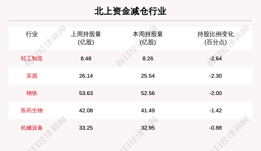 一周北上资金减仓的行业共有7个。其中,轻工制造行业减仓最明显,北上资金持股数环比减少2.64%。其他北上资金减仓较多的行业还包括采掘、钢铁、医药生物。