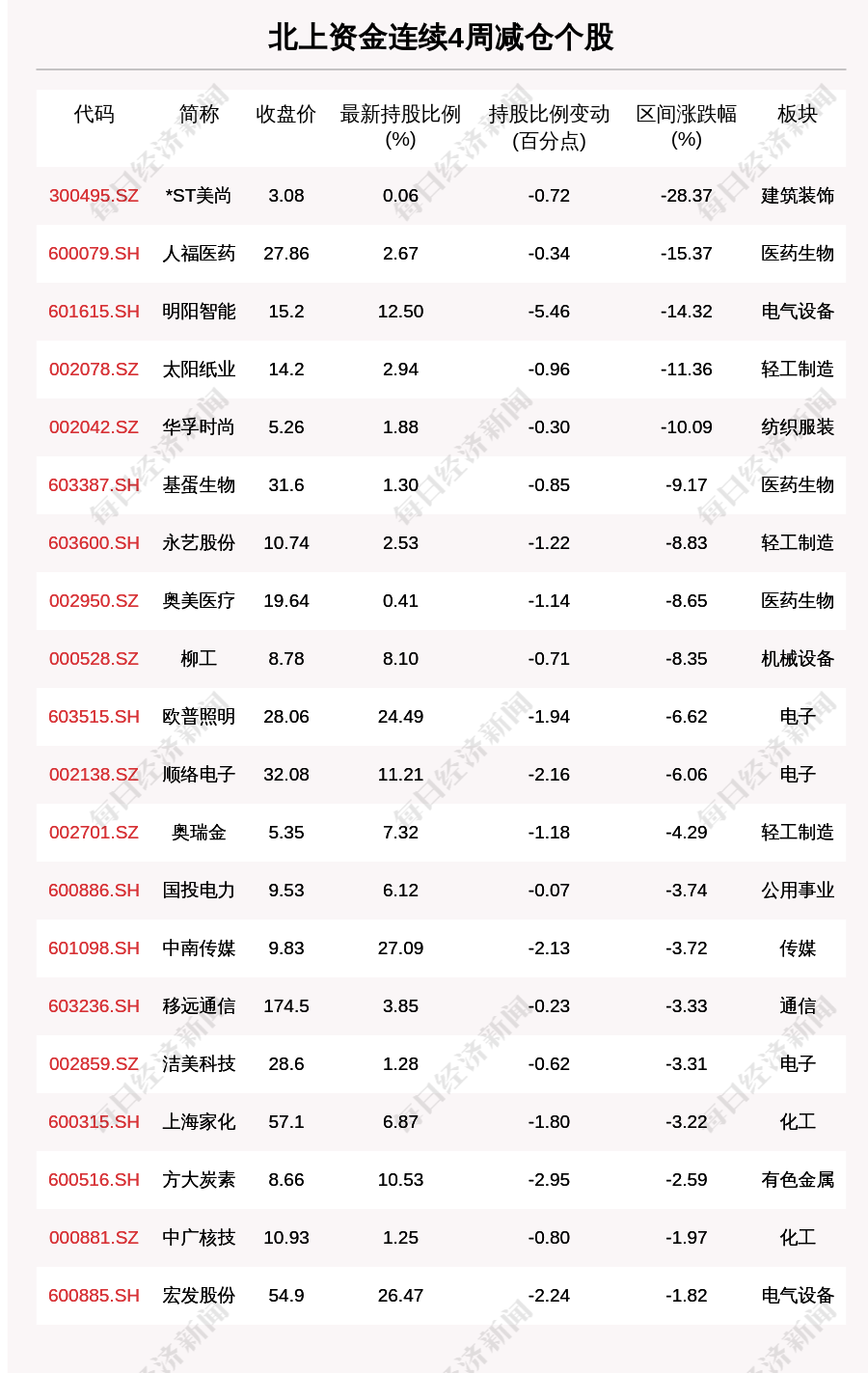 北上资金连续4周卖出59个股,其中传媒行业的个股最多,有8只。从市场表现来看,北上资金连续4周的减仓个股中,上周25只个股股价下跌,其中*ST美尚(300495.SZ,收盘价:3.08元)跌幅最大,下跌28.37%,其他跌幅较大的个股包括人福医药(600079.SH,收盘价:27.86元)、明阳智能(601615.SH,收盘价:15.2元)、太阳纸业(002078.SZ,收盘价:14.2元)。