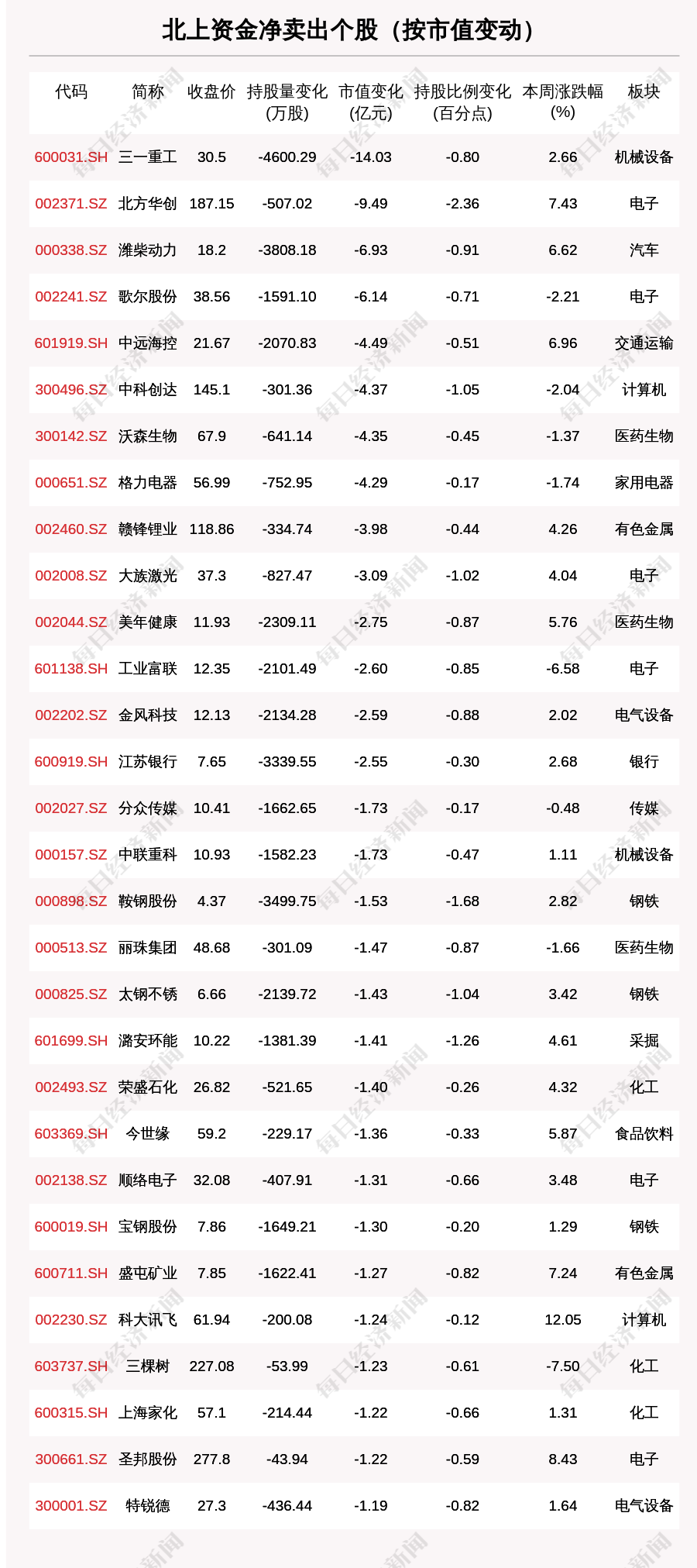 按照北向资金减持市值排序,三一重工(600031.SH,收盘价:30.5元)减持市值最大,减持市值14.031亿元,环比减少6.55%。其他北上资金减持市值较多的个股还包括北方华创(002371.SZ,收盘价:187.15元)、潍柴动力(000338.SZ,收盘价:18.2元)、歌尔股份(002241.SZ,收盘价:38.56元)。