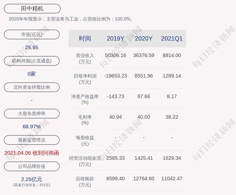 2020年年报显示,田中精机的主营业务为工业,占营收比例为:100.0%。