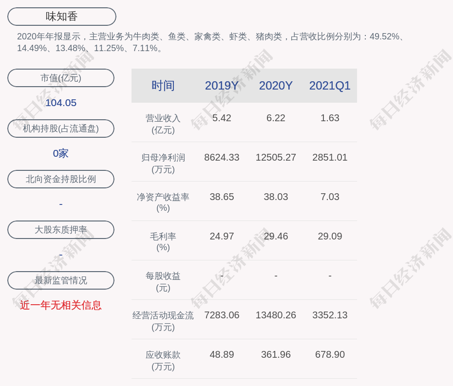 2020年年报显示,味知香的主营业务为牛肉类、鱼类、家禽类、虾类、猪肉类,占营收比例分别为:49.52%、14.49%、13.48%、11.25%、7.11%。