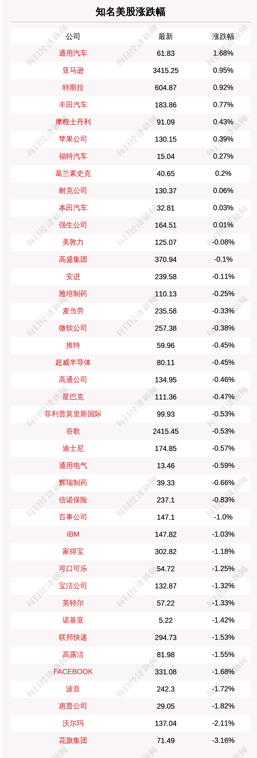 每经AI快讯:北京时间6月17日05:30,知名美股中通用汽车、亚马逊、特斯拉、丰田汽车、摩根士丹利涨幅居前,收盘分别上涨1.68%、0.95%、0.92%、0.77%、0.43%。花旗集团、沃尔玛、惠普公司、波音、FACEBOOK跌幅居前,收盘分别下跌3.16%、2.11%、1.82%、1.72%、1.68%。