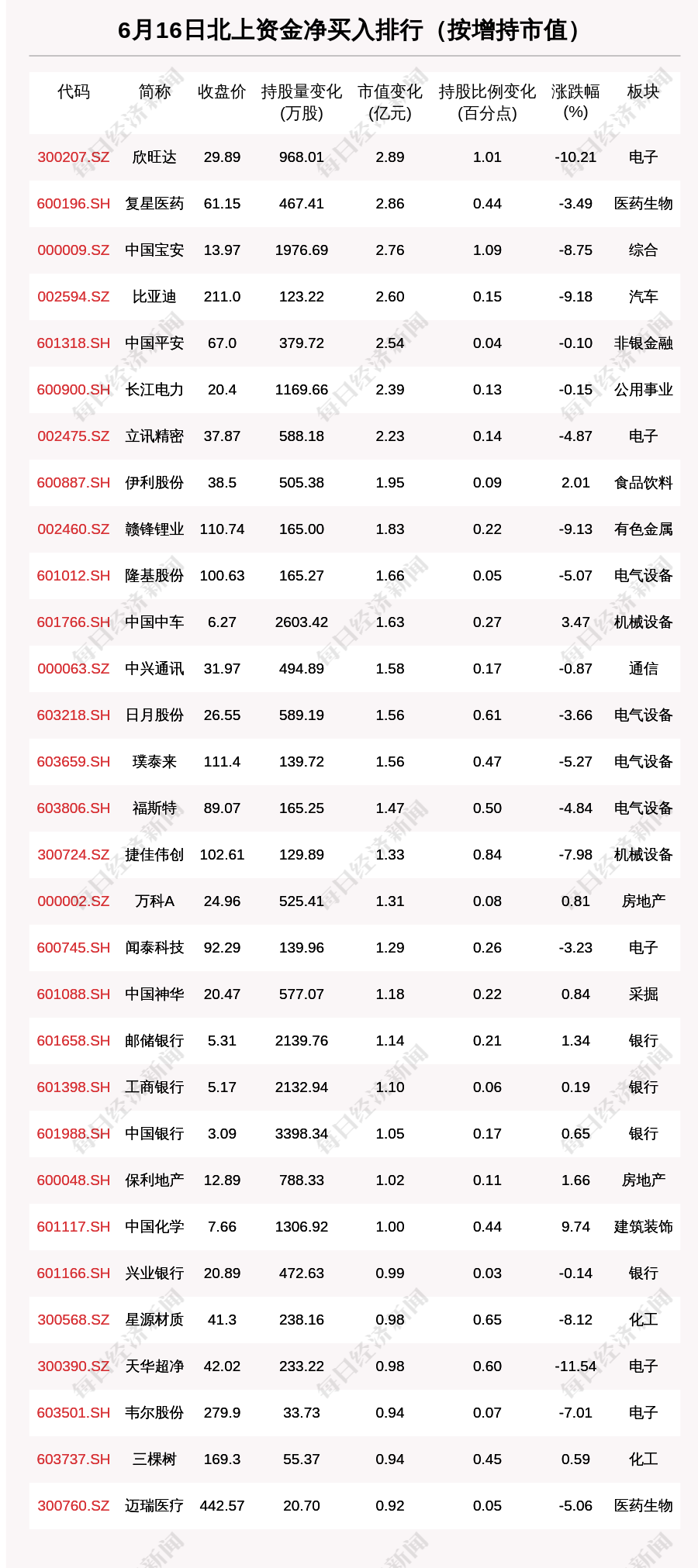 6月16日,按照北向资金增持市值排序,欣旺达(300207.SZ,收盘价:29.89元)增持市值最大,增持市值2.893亿元,环比增加10.48%。其他北上资金增持市值较多的个股还包括复星医药(600196.SH,收盘价:61.15元)、中国宝安(000009.SZ,收盘价:13.97元)、比亚迪(002594.SZ,收盘价:211.0元)。