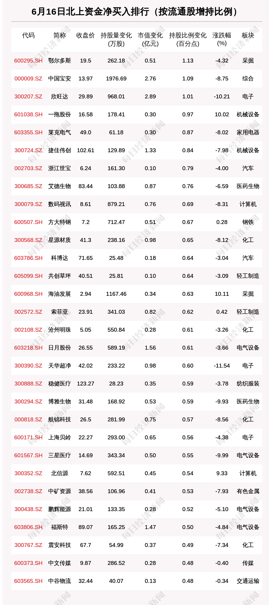 每经AI快讯,6月16日,北上资金净买入的个股共有702只,北上资金加仓比例超1%的有620只。其中,鄂尔多斯(600295.SH,收盘价:19.5元)加仓比例最为明显,最新持股比例12.79%,环比增加1.13个百分点。其他北上资金加仓比例较多的个股还包括中国宝安(000009.SZ,收盘价:13.97元)、欣旺达(300207.SZ,收盘价:29.89元)、一拖股份(601038.SH,收盘价:16.58元)。