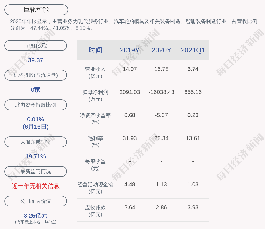2020年年报显示,巨轮智能的主营业务为现代服务行业、汽车轮胎模具及相关装备制造、智能装备制造行业,占营收比例分别为:47.44%、41.05%、8.15%。