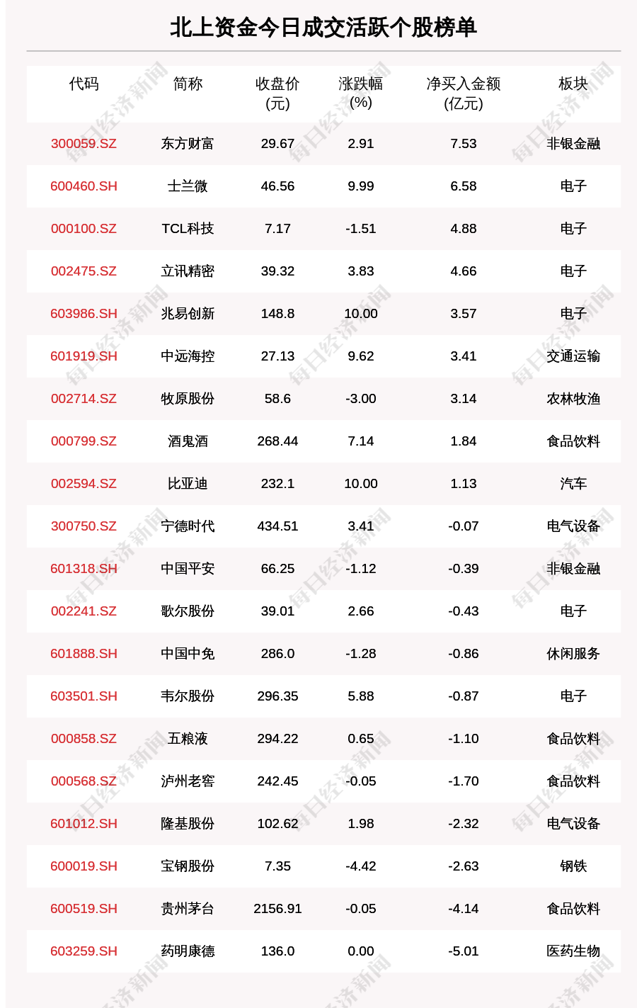 6月17日,北上资金成交活跃个股榜单中,净买入个股共9只,金额最多的是东方财富(300059.SZ,收盘价:29.67元),净买入7.532亿元;净卖出个股共11只,金额最多的是药明康德(603259.SH,收盘价:136.0元),净卖出5.010亿元。