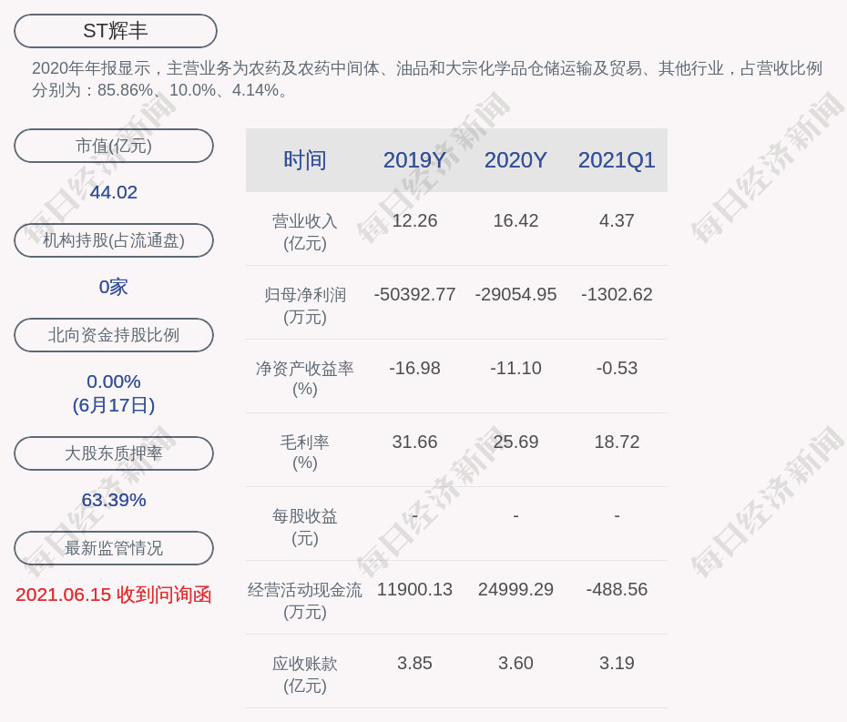 2020年年报显示,ST辉丰的主营业务为农药及农药中间体、油品和大宗化学品仓储运输及贸易等。