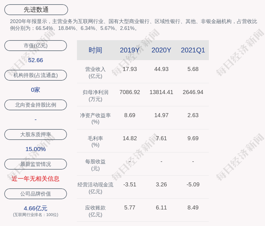 2020年年报显示,先进数通的主营业务为互联网行业、国有大型商业银行、区域性银行、其他、非银金融机构,占营收比例分别为:66.54%、18.84%、6.34%、5.67%、2.61%。