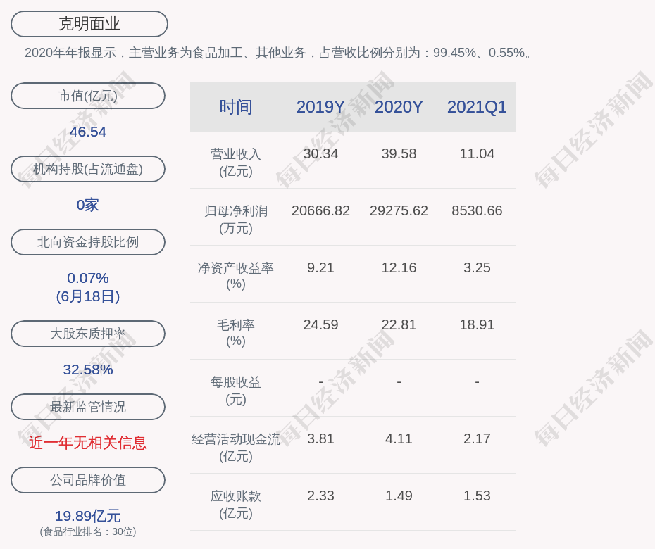 2020年年报显示,克明面业的主营业务为食品加工、其他业务,占营收比例分别为:99.45%、0.55%。
