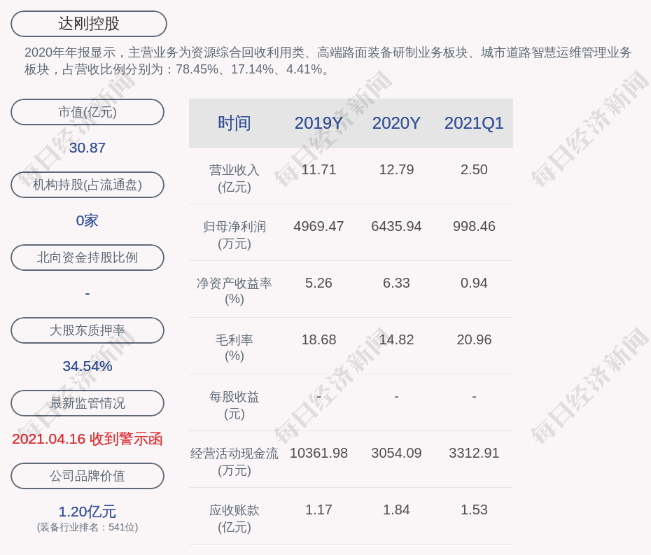 2020年年报显示,达刚控股的主营业务为资源综合回收利用类、高端路面装备研制业务板块、城市道路智慧运维管理业务板块,占营收比例分别为:78.45%、17.14%、4.41%。