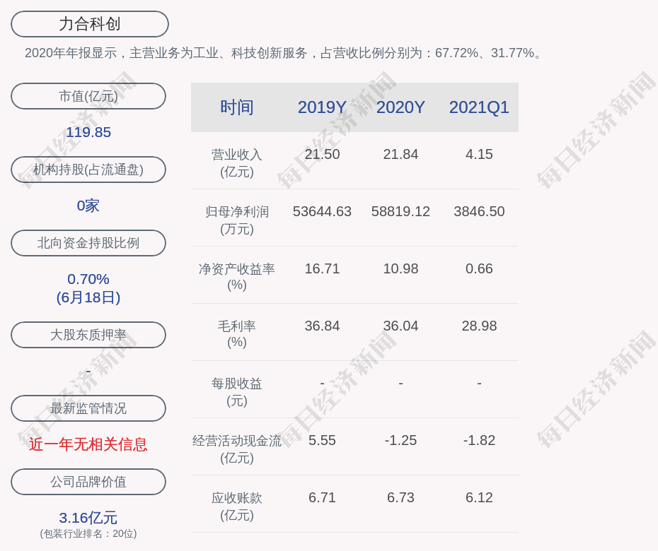2020年年报显示,力合科创的主营业务为工业、科技创新服务,占营收比例分别为:67.72%、31.77%。