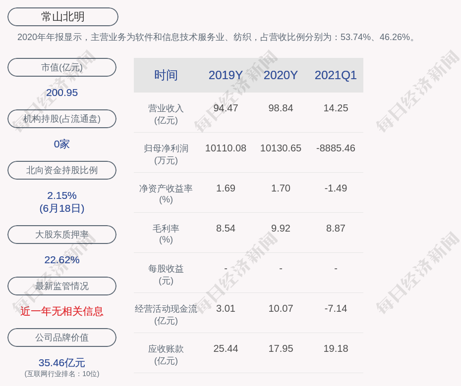 2020年年报显示,常山北明的主营业务为软件和信息技术服务业、纺织,占营收比例分别为:53.74%、46.26%。