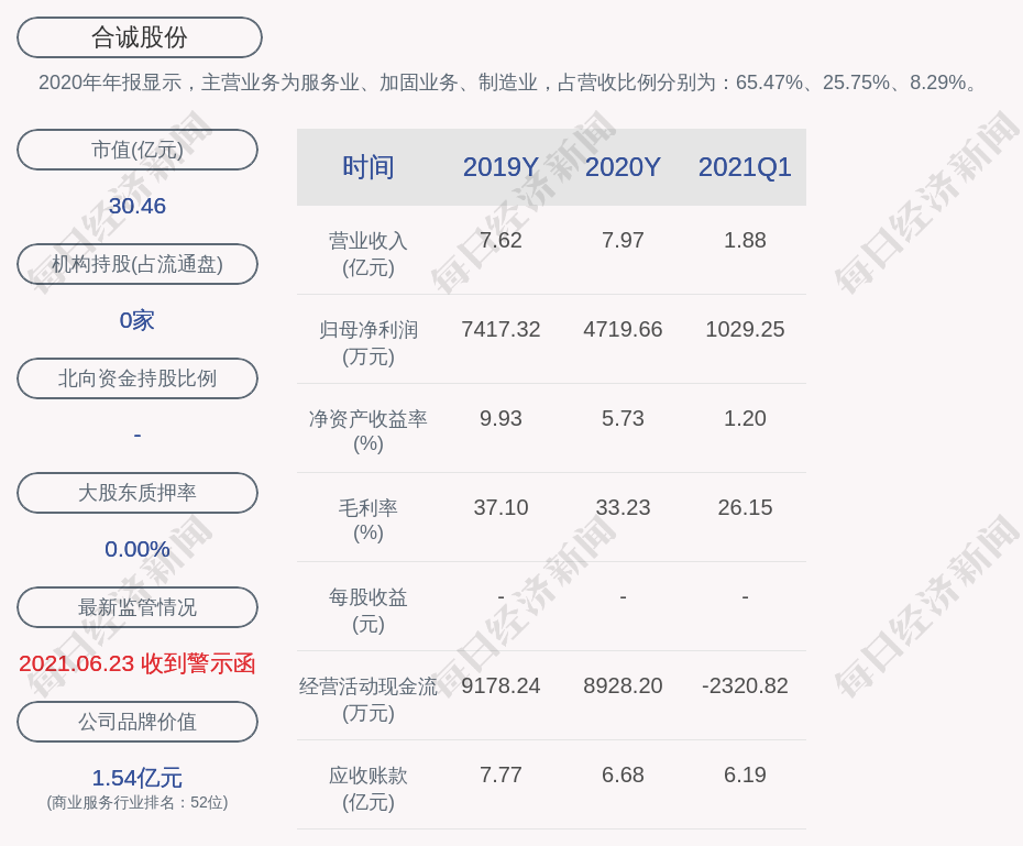 2020年年报显示,合诚股份的主营业务为服务业、加固业务、制造业,占营收比例分别为:65.47%、25.75%、8.29%。